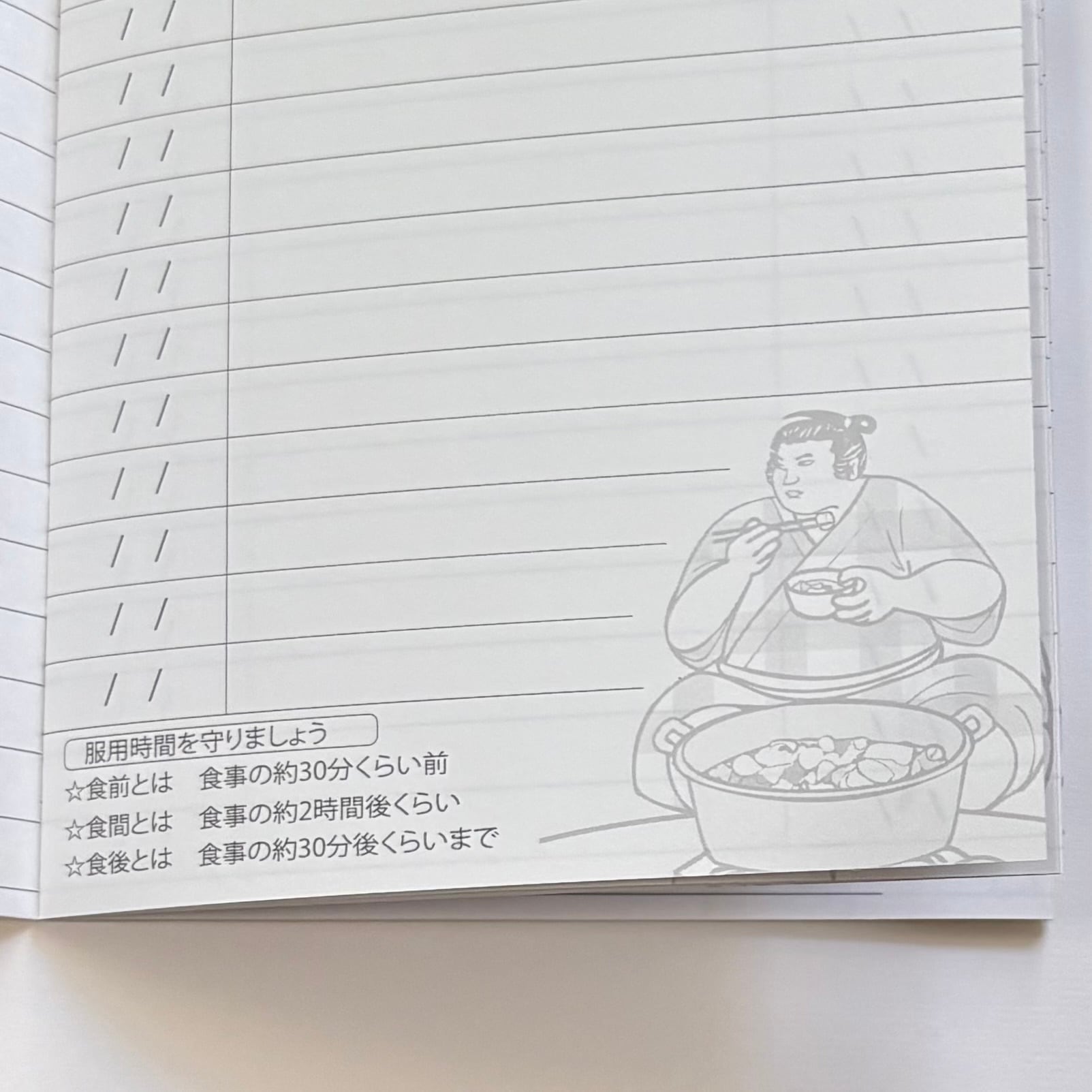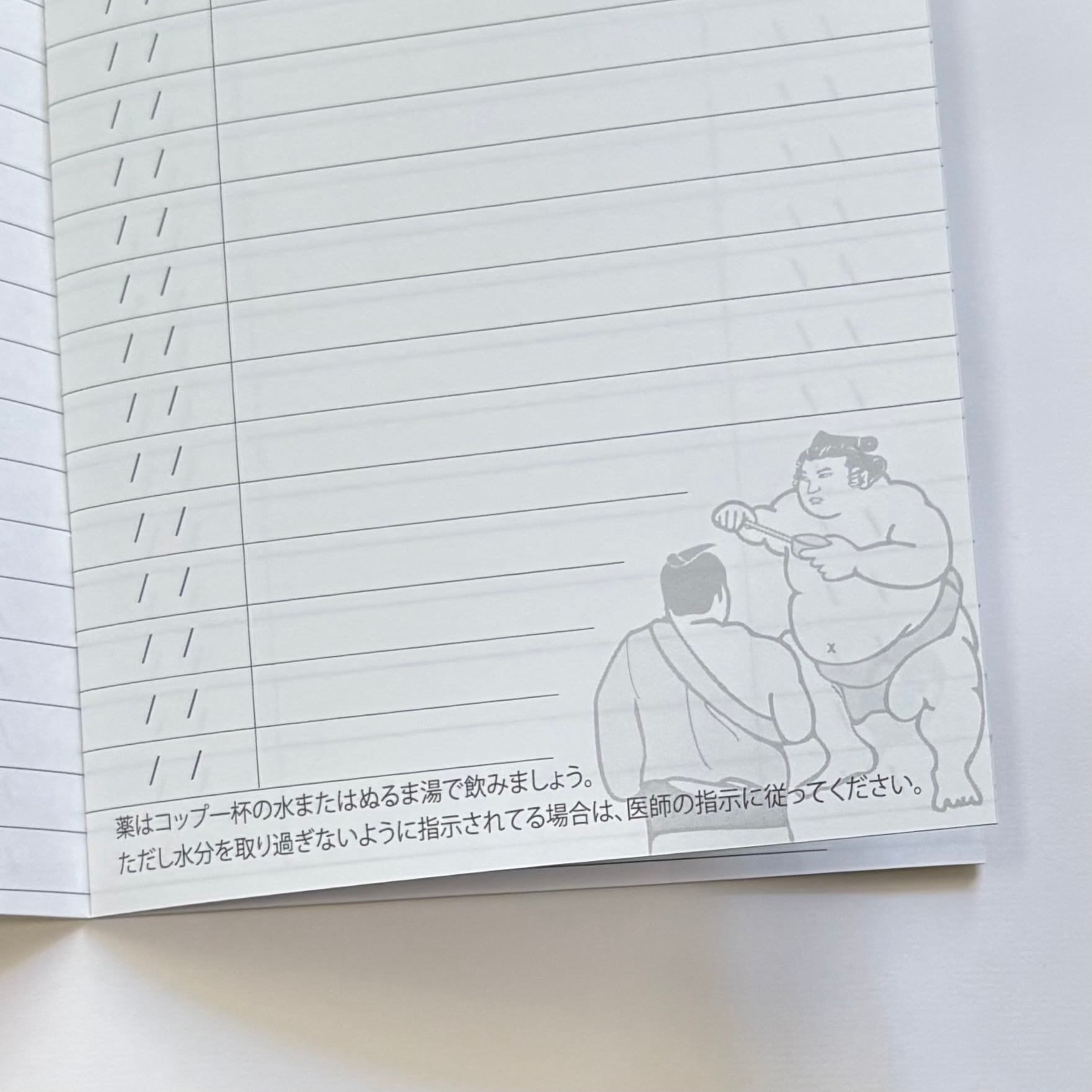 おくすり記録ページには力士からのご注意メッセージが。